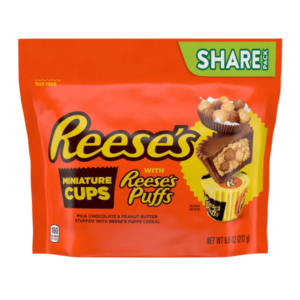 Reese’s Miniature With Puffs 272g Chocolate con crema de cacahuete y cereales Ingredientes: Chocolate con leche (azúcar, manteca de cacao, chocolate, leche desnatada , grasa de leche , lactosa (de leche ), emulgentes ( lecitina de soja , E476)), cacahuetes , azúcar,…