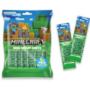 Minecraft Mini Chewy Shots 90g Pequeños caramelos masticables de color verde con sabor a manzana. Ingredientes: azúcar, jarabe de maíz, aceite de palma, agua, zumo…