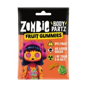 Zombie Fruit Body Partz Gummies 35g Gominolas Ingredientes: jugo concentrado de miel (94%), pectina, corrector de acidez: ácido cítrico, colorantes naturales (caroteína negra, barbabietola, clorofila,…