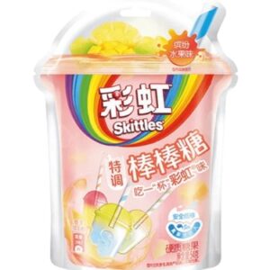Skittles Lolly Tea 54g Piruletas sabor a tés famosos Sabor a manzana y saúco: Azúcar, jarabe de malta, acidulante (E270), antioxidante (E325), colorantes (E102*, E133,…