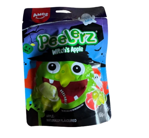 Ingredientes: Jarabe de glucosa, azúcar, gelatina (de cerdo), agua, acidulantes (E330, E296), aroma, colorantes (E120, E133, E160a), agente de recubrimiento (cera de carnauba).