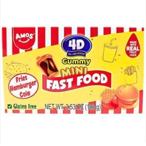 INGREDIENTES: Jarabe de glucosa, azúcar, agua, gelatina, humectante (sorbitol), reguladores de acidez (ácido cítrico, ácido málico), agente espesante (pectina), aromas artificiales, agentes de recubrimiento (aceite de palma, cera de carnauba), colorantes (E129, E171). Por 100g: 1395 kJ (333 kcal) Grasas: 0 g Saturadas: 0 g Carbohidratos: 76.6 g Azúcares: 56.6 g Proteínas: 6.6 g Sal: 0.05 g