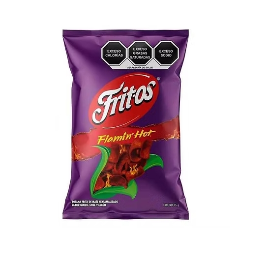 Maíz nixtamalizado, aceite vegetal, especias, maltodextrina, ácido cítrico, sal yodada, sabores naturales, idénticos a los naturales y artificiales (cebada Continental), cloruro de potasio, glutamato monosódico, proteína vegetal hidrolizada de soya y maíz, azúcar añadido (azúcar dextrosa), queso, Rojo Allura AC y sus lacas, hierbas y especias, bicarbonato de sodio, aceite vegetal, estearato de calcio, dióxido de silicio, guanilato de sodio, inosinato de sodio, hidrolizado de levadura, Amarillo Ocaso FCF y sus lacas, ácido málico, ácido fumárico, silicato de calcio, ácido acético, fosfato de potasio, tomate, grasa butírica, ácido láctico, caramelo de clase IV, Azul Brillante FCF y sus lacas, harina de arroz, fosfato de calcio, caramelo de clase III, tocoferoles, mono y diglicéridos. Contiene leche, soya y gluten. Información nutricional: (contenido medio por 100 g/100 ml)