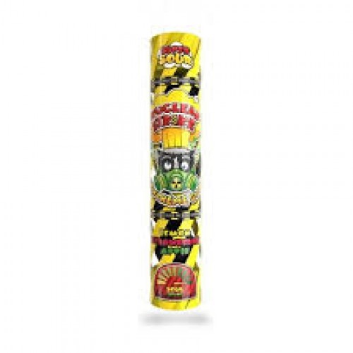 Bolas de chicle de color negro y 3 sabores súper ácidos : manzana, limón y fresa. Cada tubo de plástico con tapadera contiene 5 bolas de chicle.