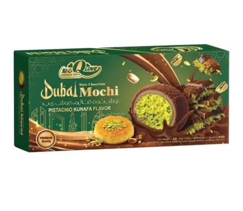 Ingredientes: Maltosa, azúcar, relleno de pistacho y chocolate (21%) [aceite vegetal (palma, soja), azúcar, cacao en polvo (10%), pasta de pistacho (5%), leche entera en polvo, manteca de cacao, emulgente (lecitina de soja), aroma], arroz glutinoso (17%), fideos de masa kunafa tostados (4%) [harina de trigo, agua, sal], espesante (almidón modificado E1442), aceite de palma, conservante (sorbato de potasio E202), emulgente (E471), colorantes (E141, E100), sal, aroma de vainilla. Información Nutricional (por 100g): Valor energético: 1645 kJ / 393 kcal; Grasas: 11,5g (de las cuales saturadas: 5,1g); Hidratos de carbono: 70,2g (de los cuales azúcares: 34,5g); Proteínas: 2,5g; Sal: 0,18g.
